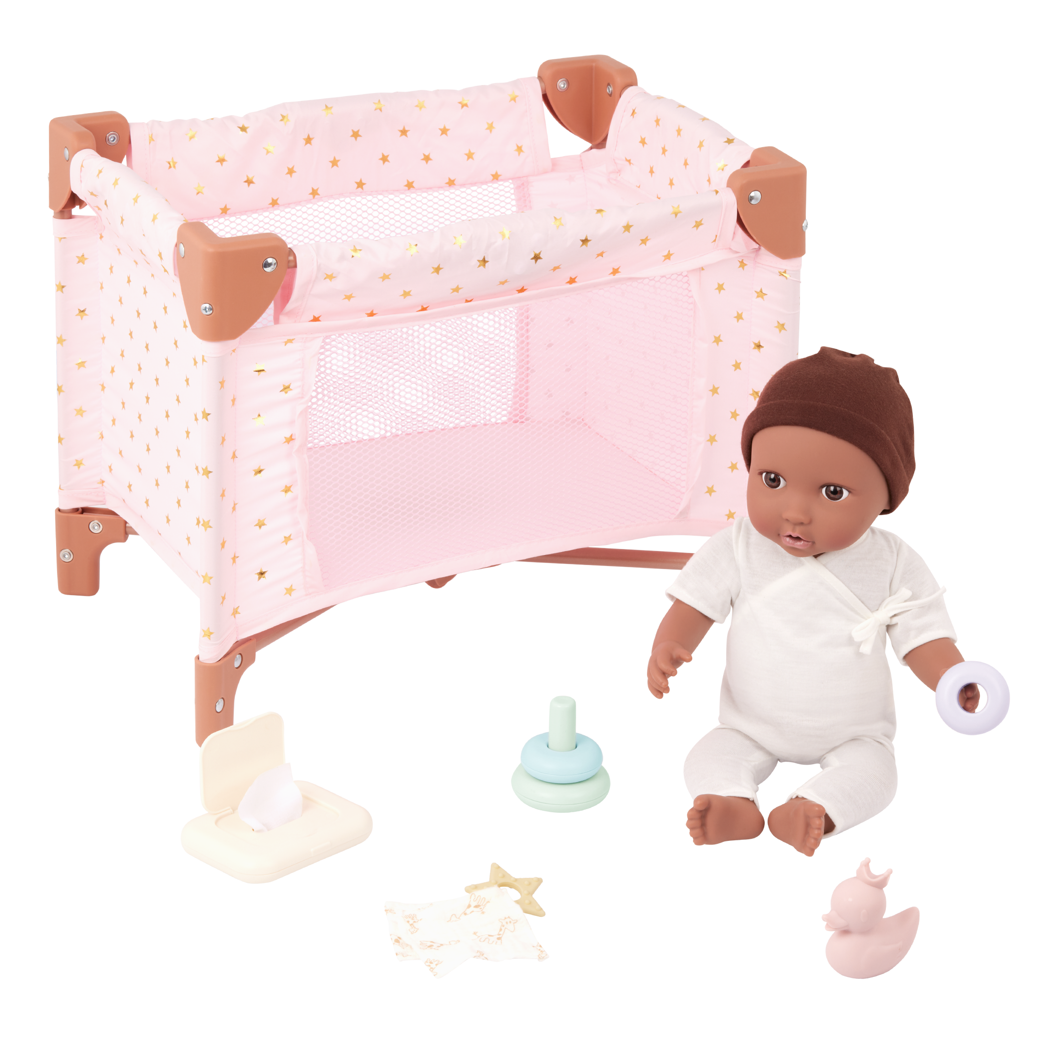 From mealtime to travel time and beyond, little ones can nurture their baby doll with a stylish collection of realistic accessories.