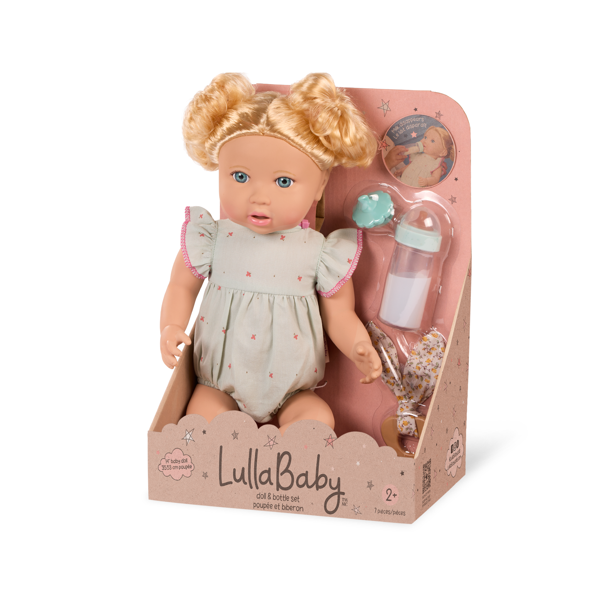 • 14” Baby Doll with Hair: An adorable baby doll with blonde hair and a soft huggable body, wearing a ruffled outfit with a disappearing milk bottle, a floral teether, and a pacifier.