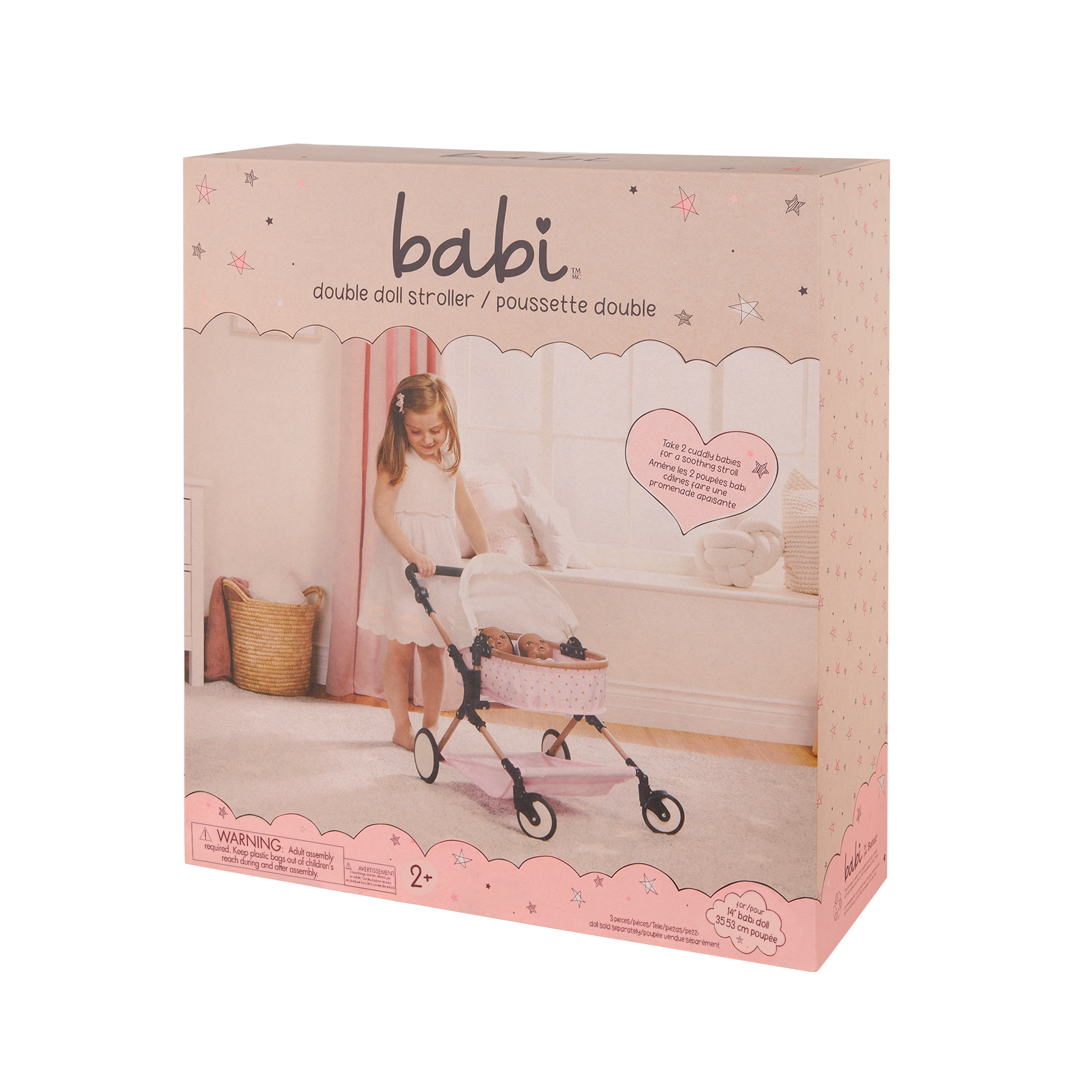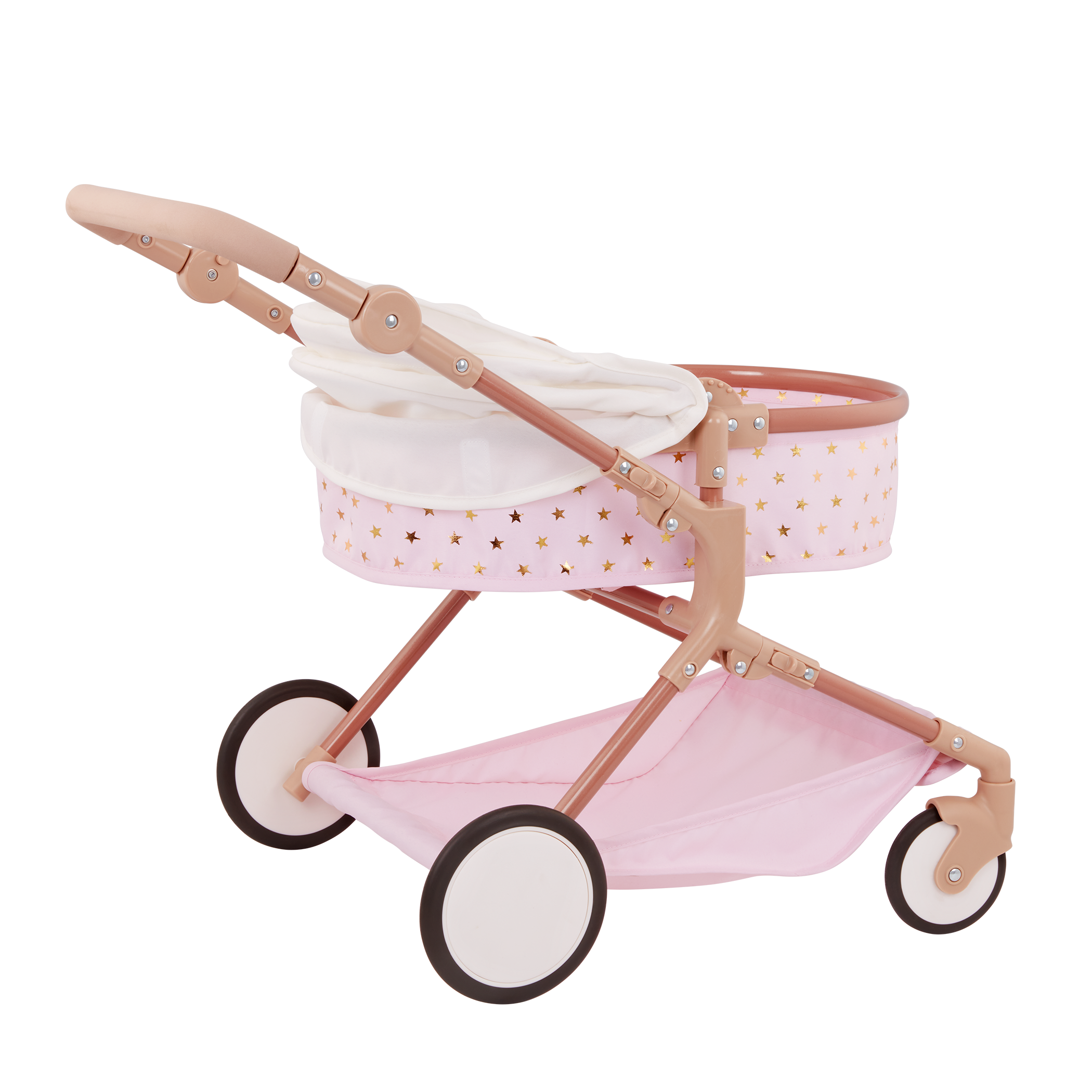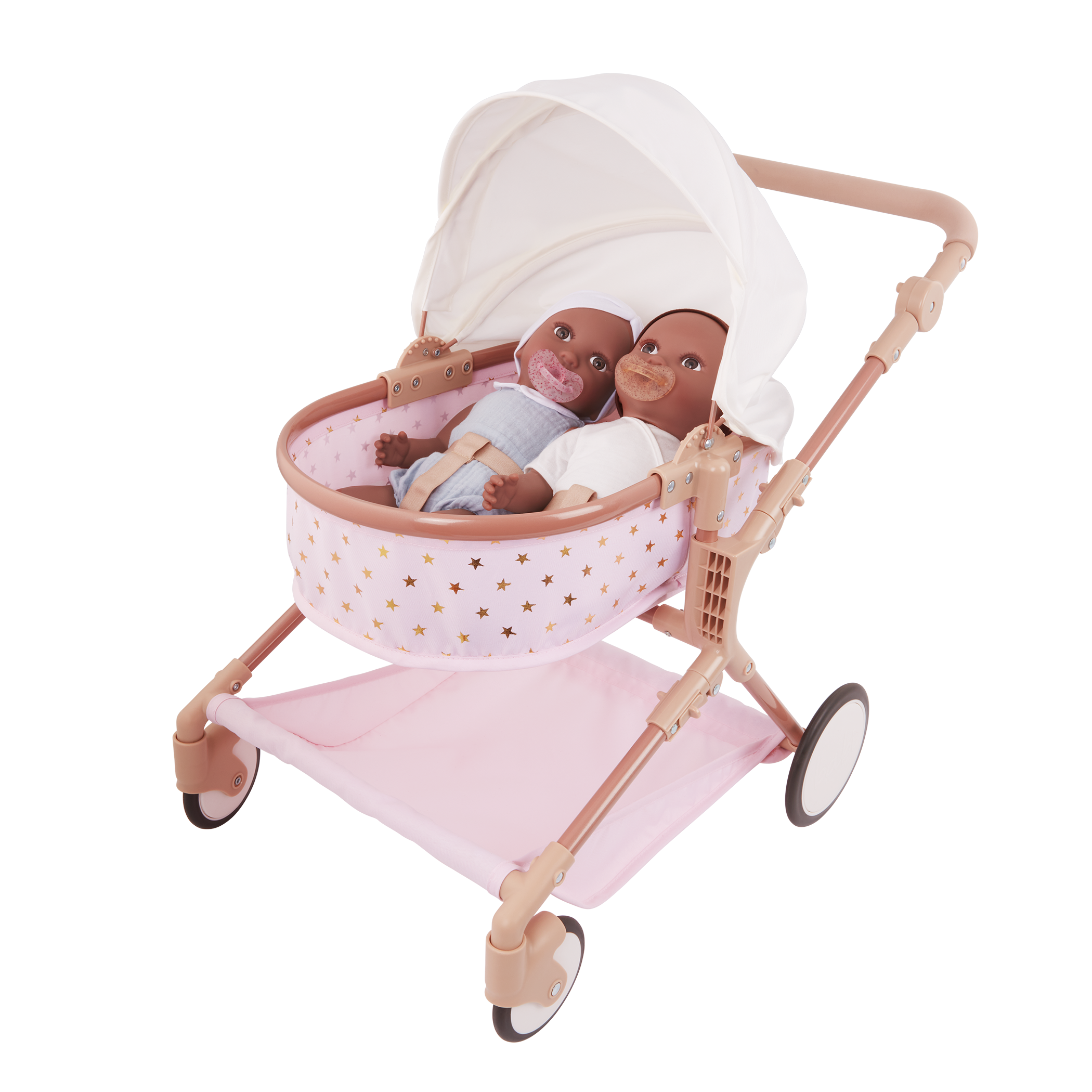 Pink Carriage – Golden Star Print- Stroll Together: The LullaBaby push-and-pull double doll stroller has a cute pale pink design with a golden star pattern and is perfect for taking twin baby dolls everywhere in style (LullaBaby dolls sold separately).